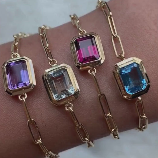 The Manhattan Chain Bracelet centers a bezel-set emerald-cut stone within a sculptural link silhouette — refined, minimal, and made to layer or stand alone.