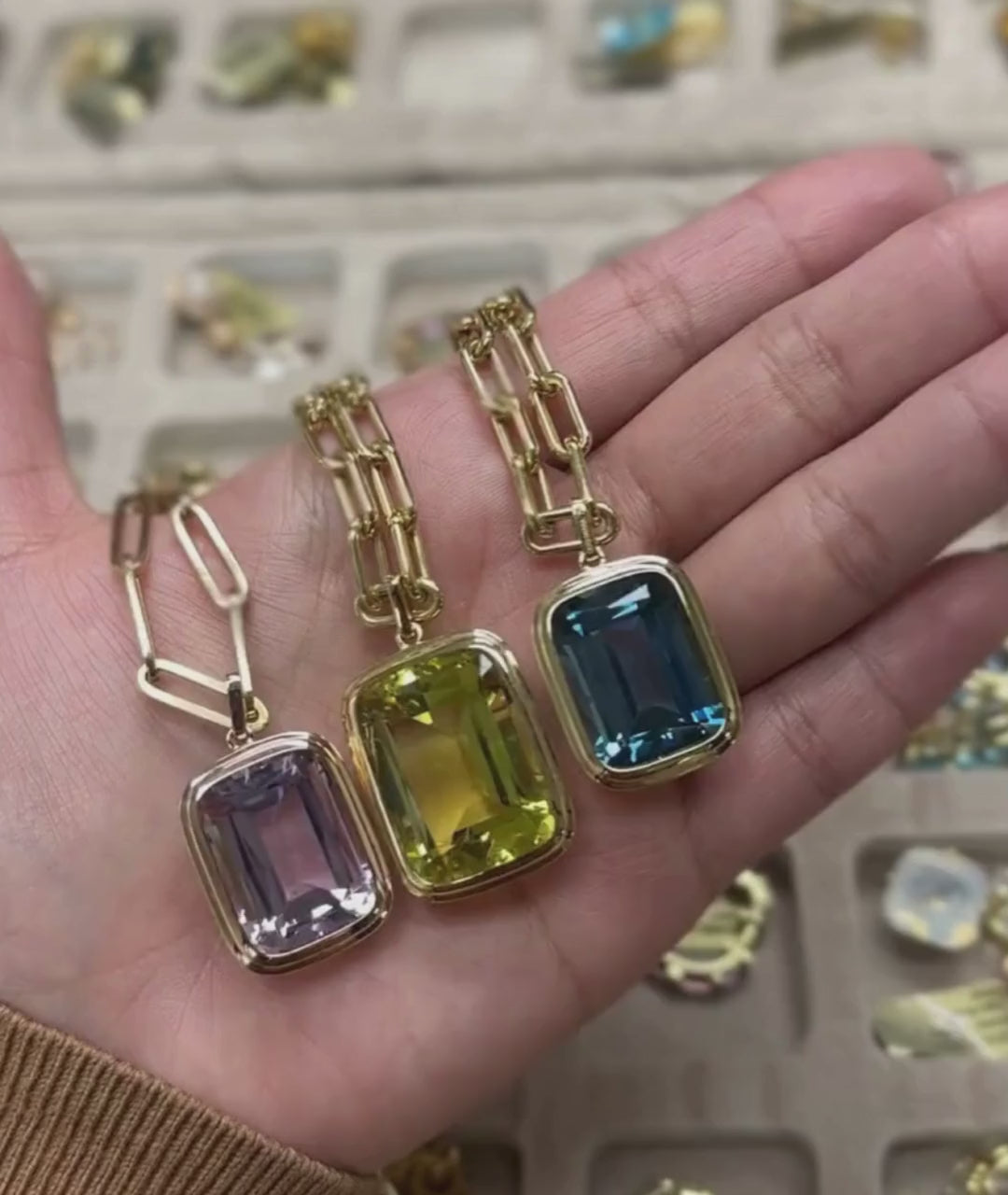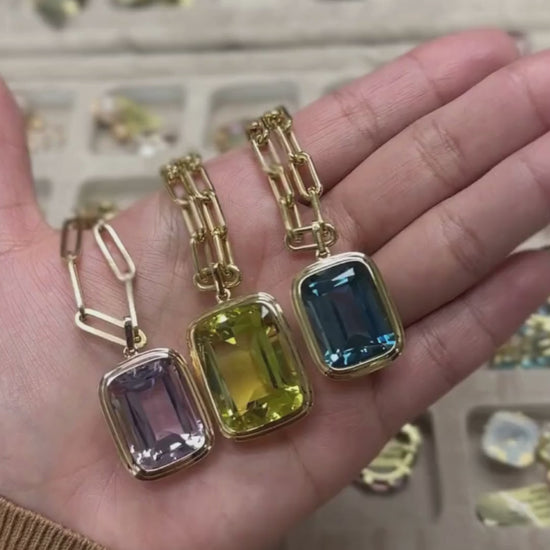 The Manhattan Cushion Pendant brings bold refinement to everyday style — featuring a soft-cornered emerald cut set in a sleek bezel and suspended from a modern open-link chain.