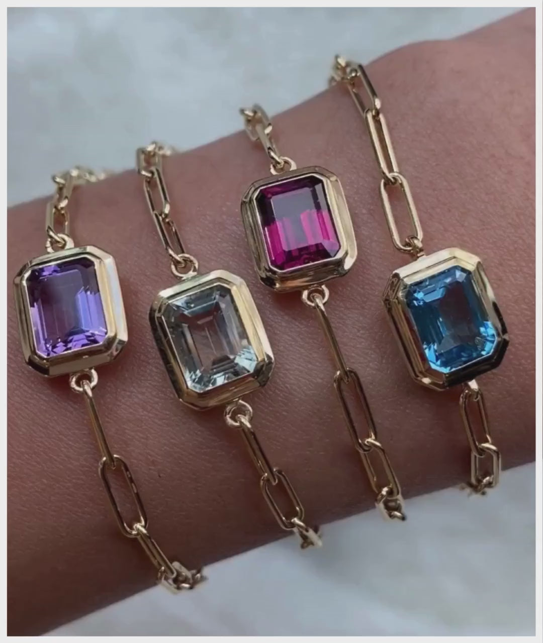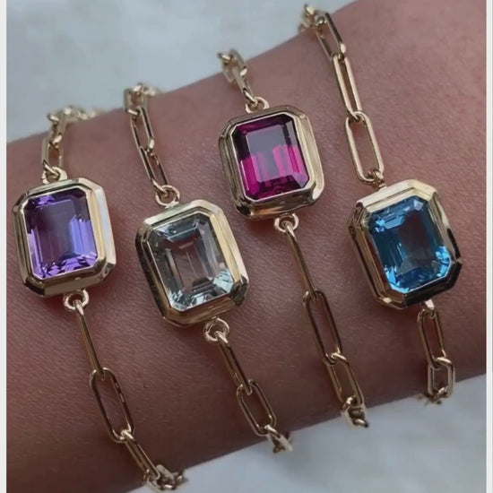The Manhattan Chain Bracelet centers a bezel-set emerald-cut stone within a sculptural link silhouette — refined, minimal, and made to layer or stand alone.