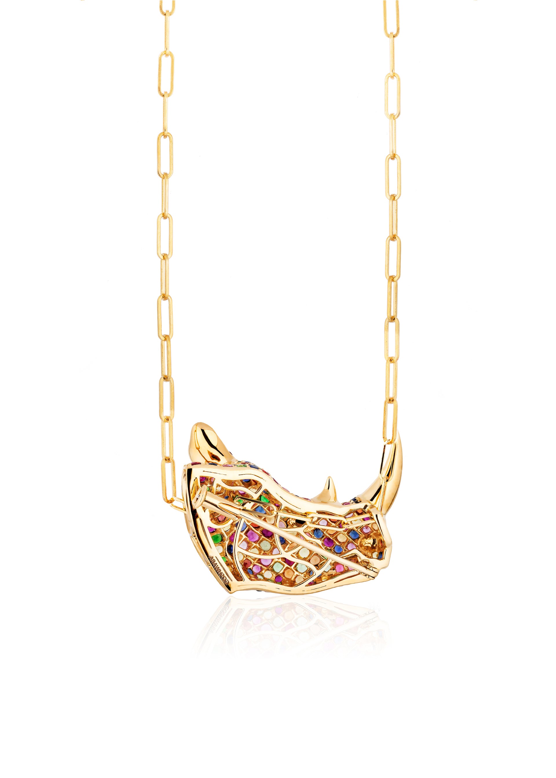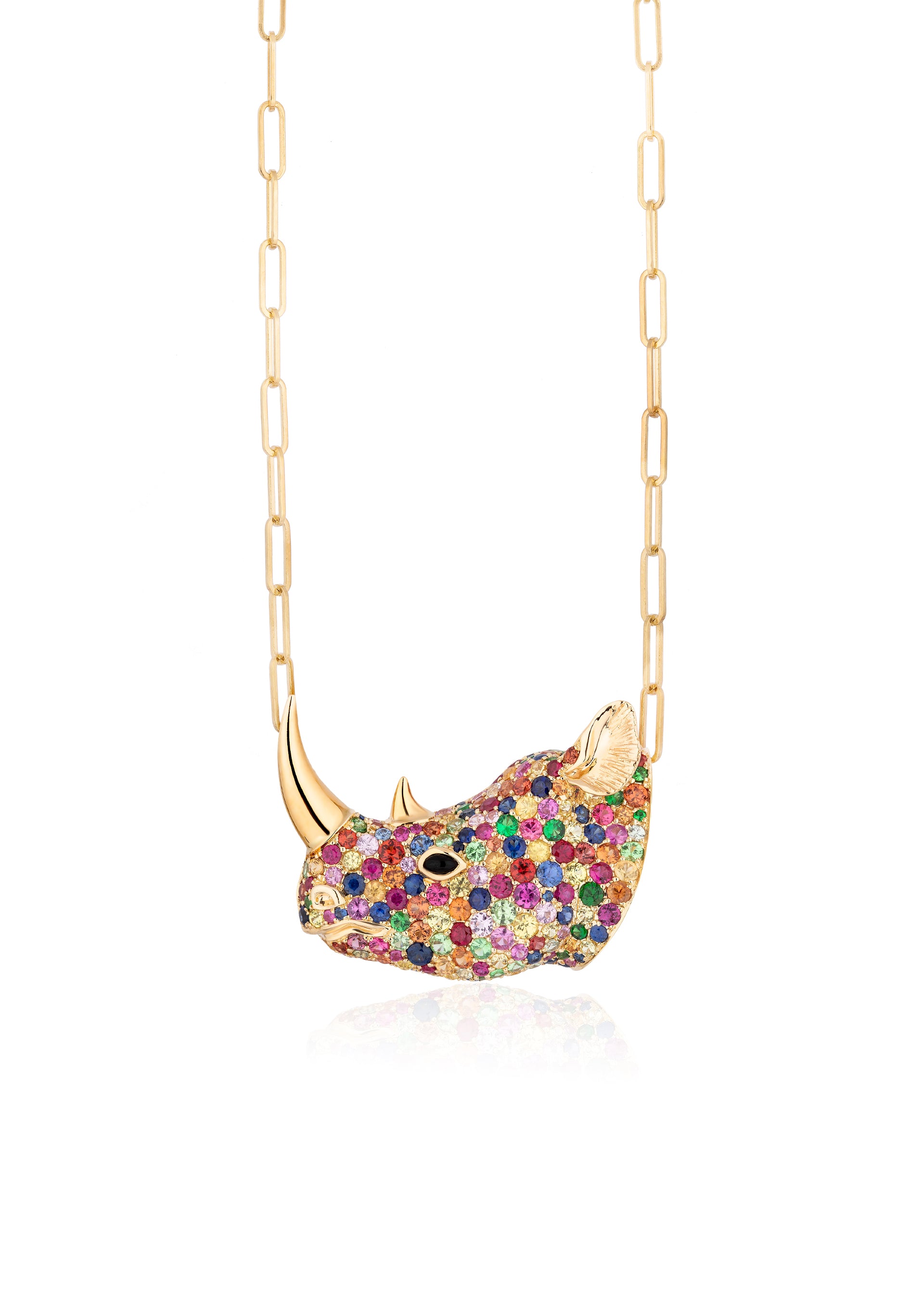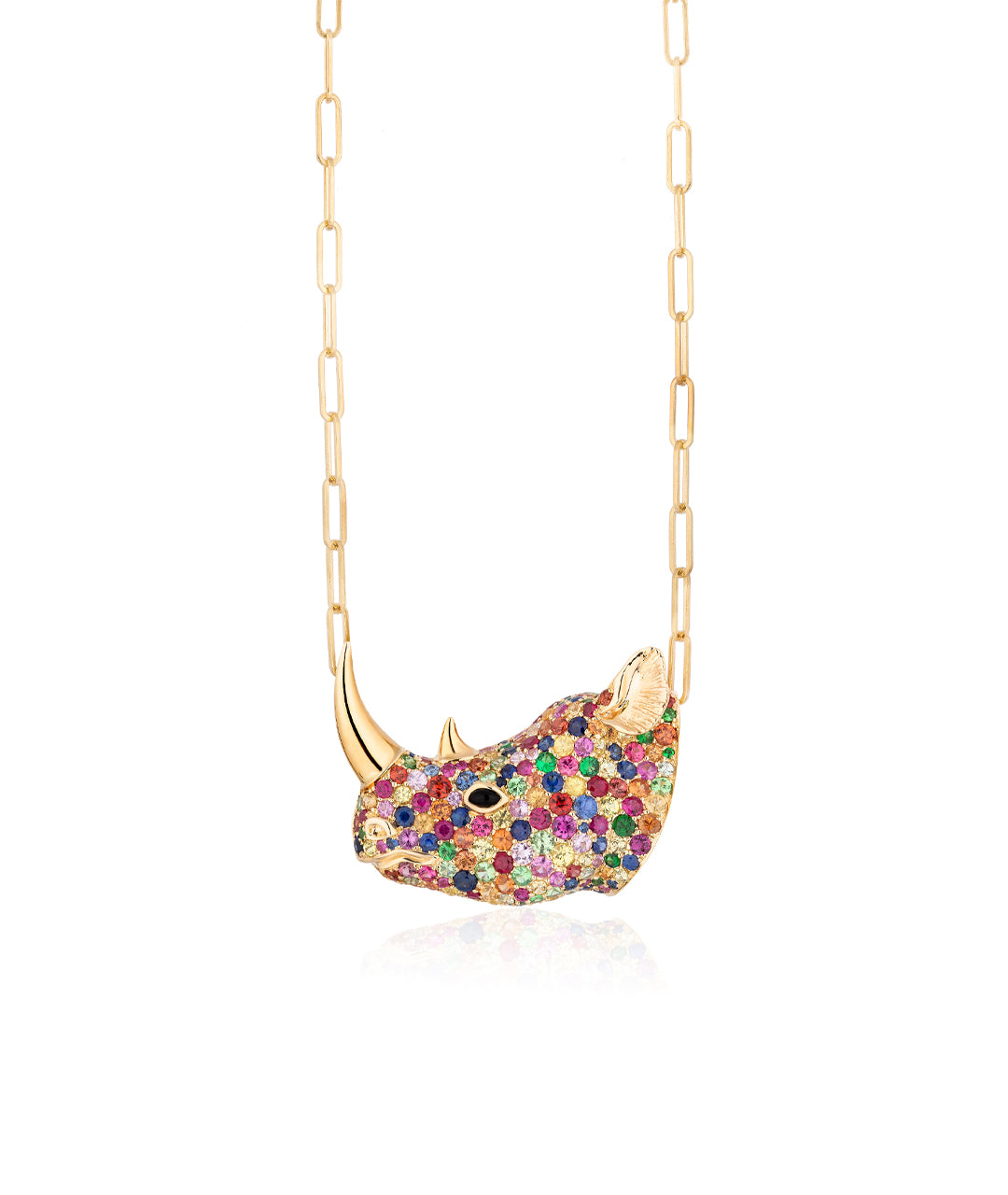 Sculpted in strength and glittering with purpose, this rhino is a tribute to power dressed in color.