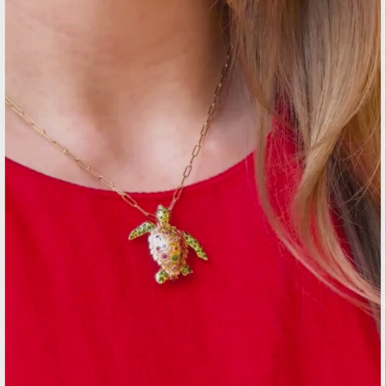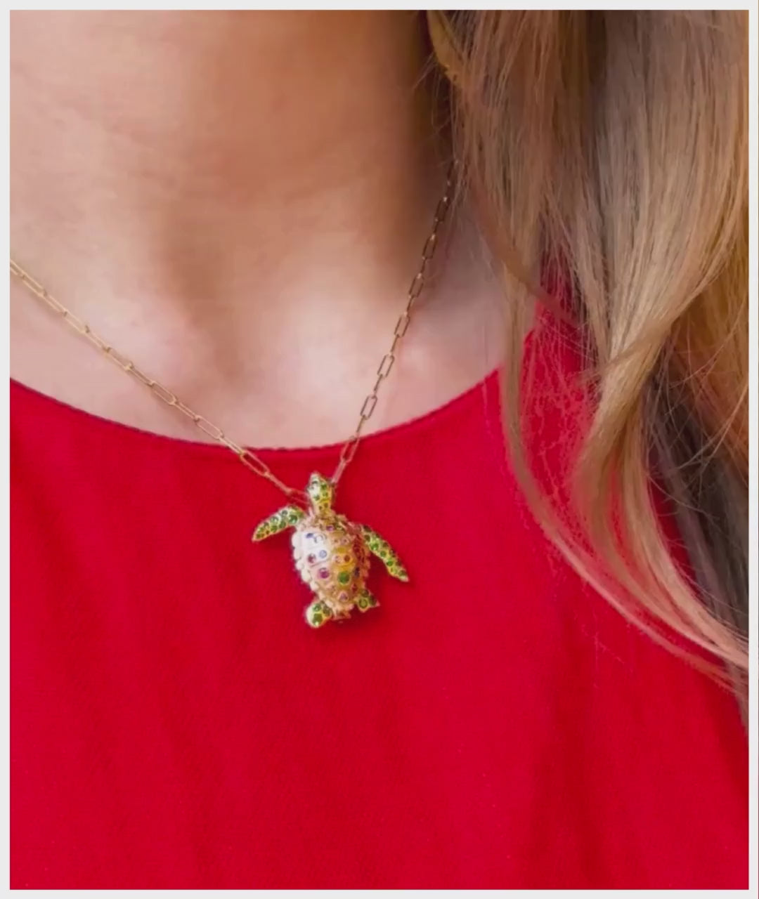 This turtle pendant-brooch captures the charm of ocean life with vibrant gemstones and playful spirit.