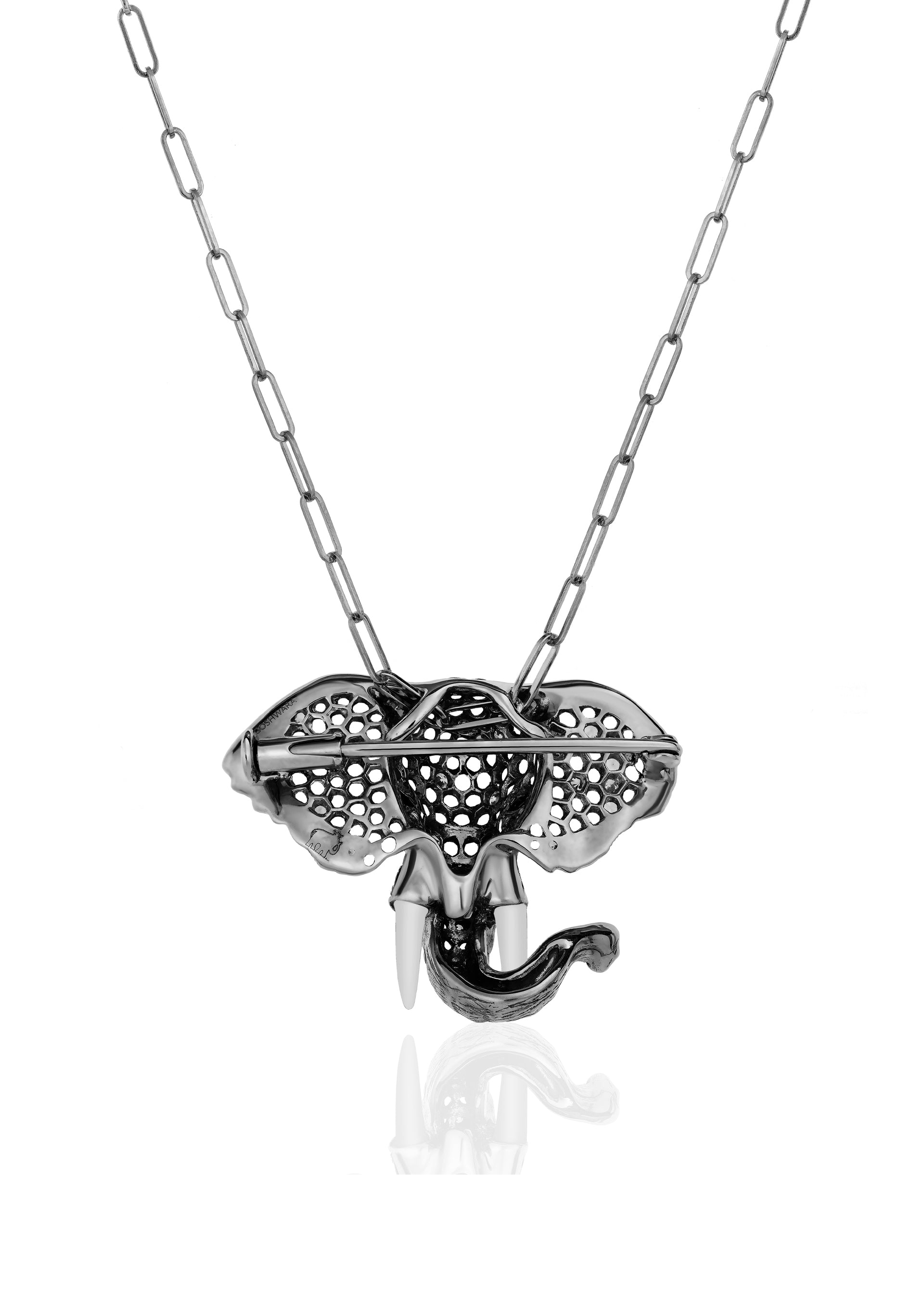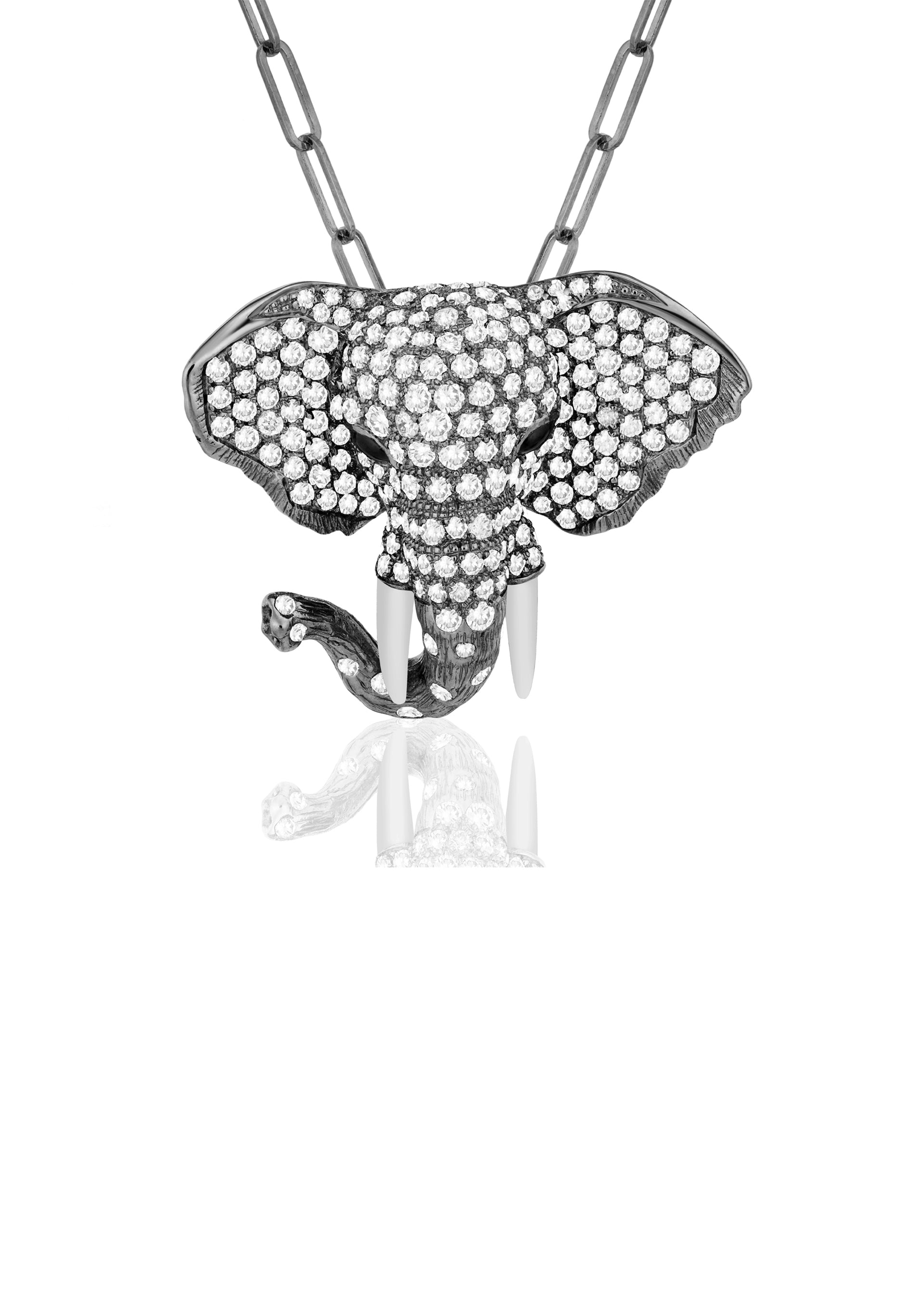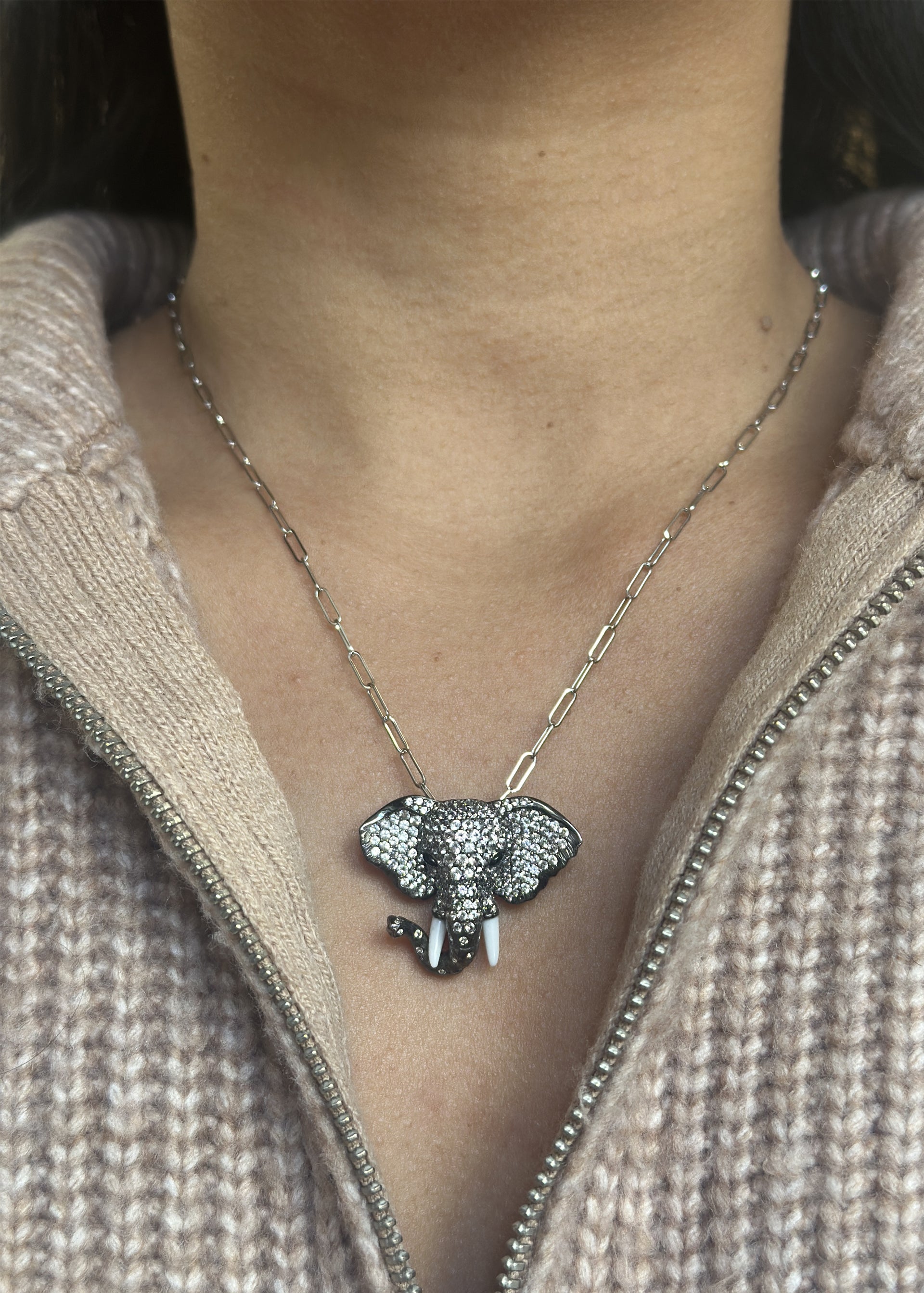 A powerful silhouette in white gold, this elephant pendant shimmers with white sapphires—capturing strength, wisdom, and elegance in one radiant form.
