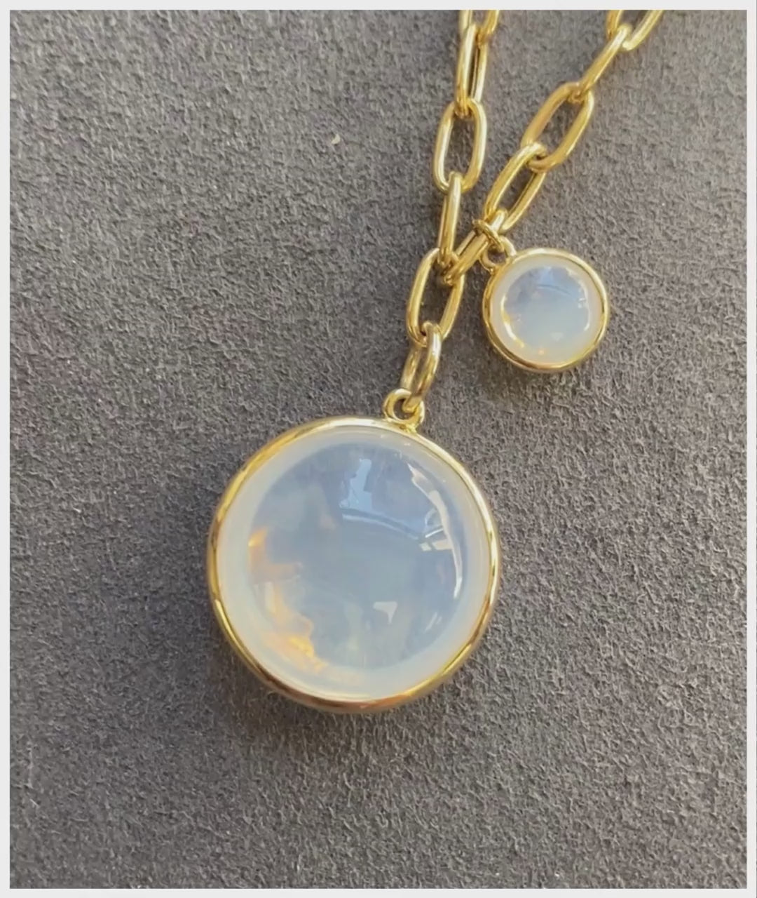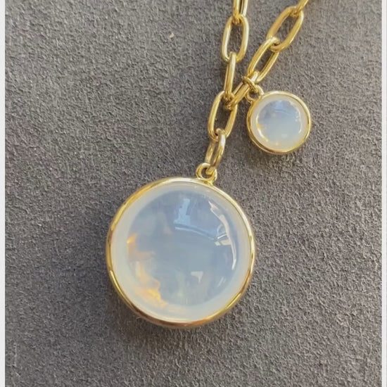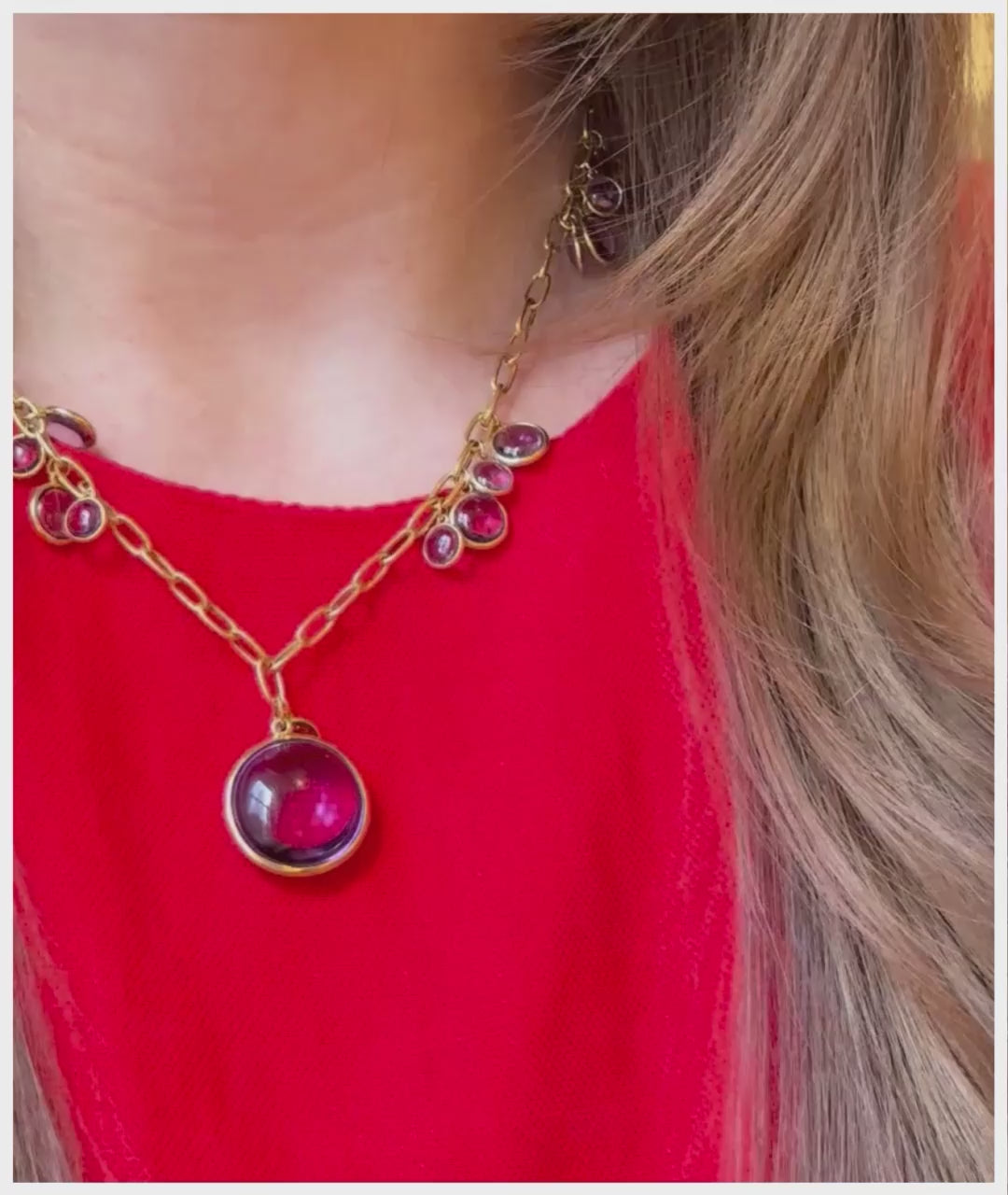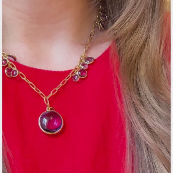Whimsy takes shape in this playful necklace, where scattered cabochons drift along oversized links, anchored by a bold centerpiece drop.