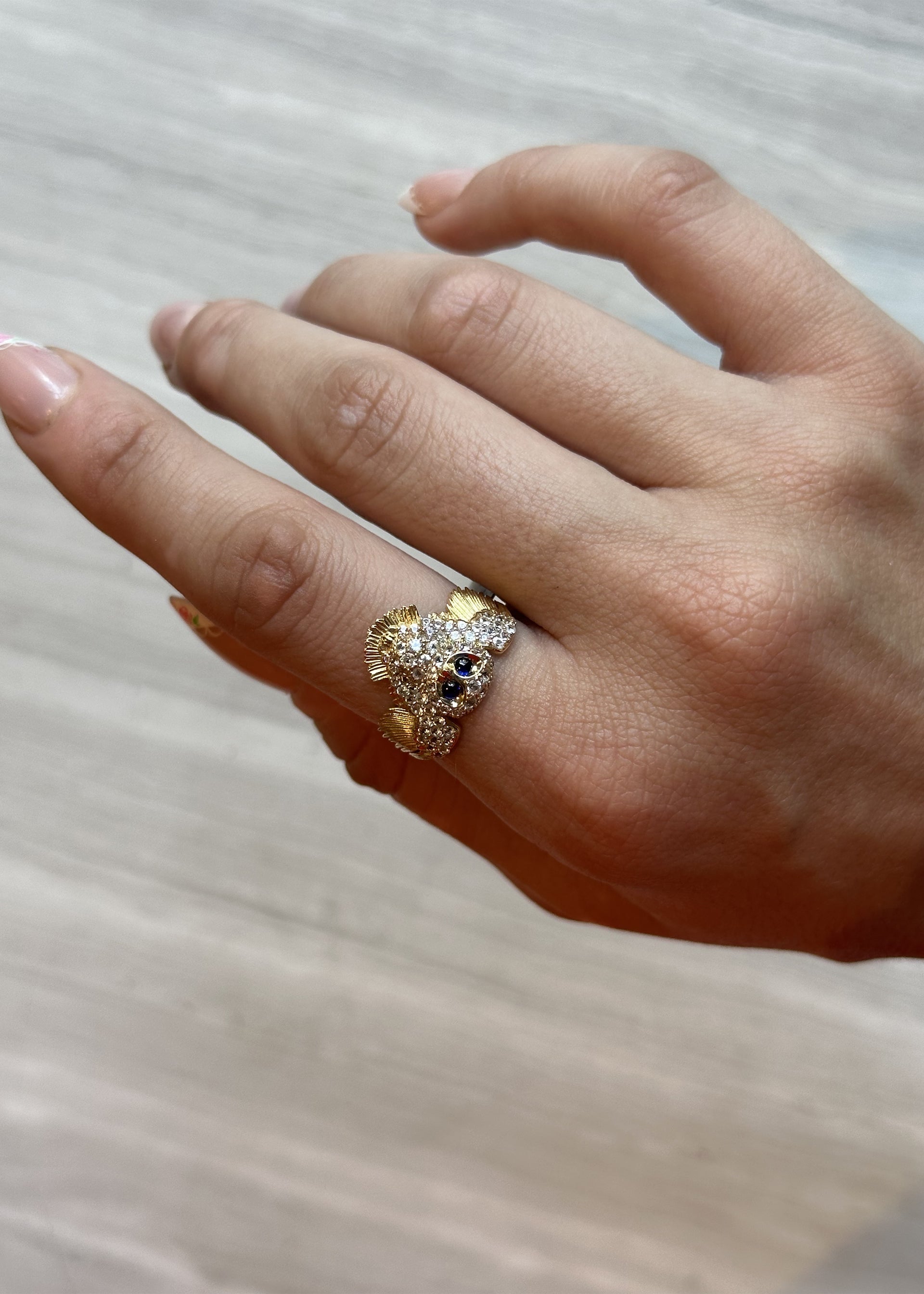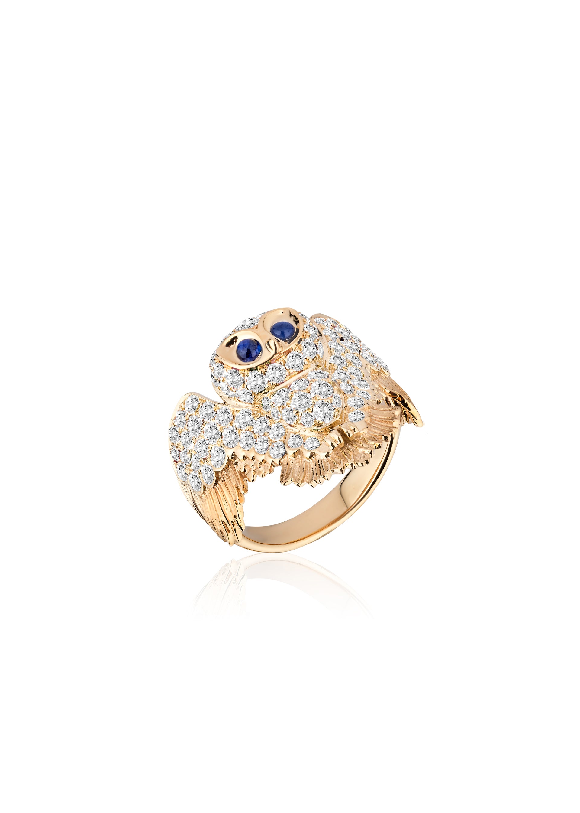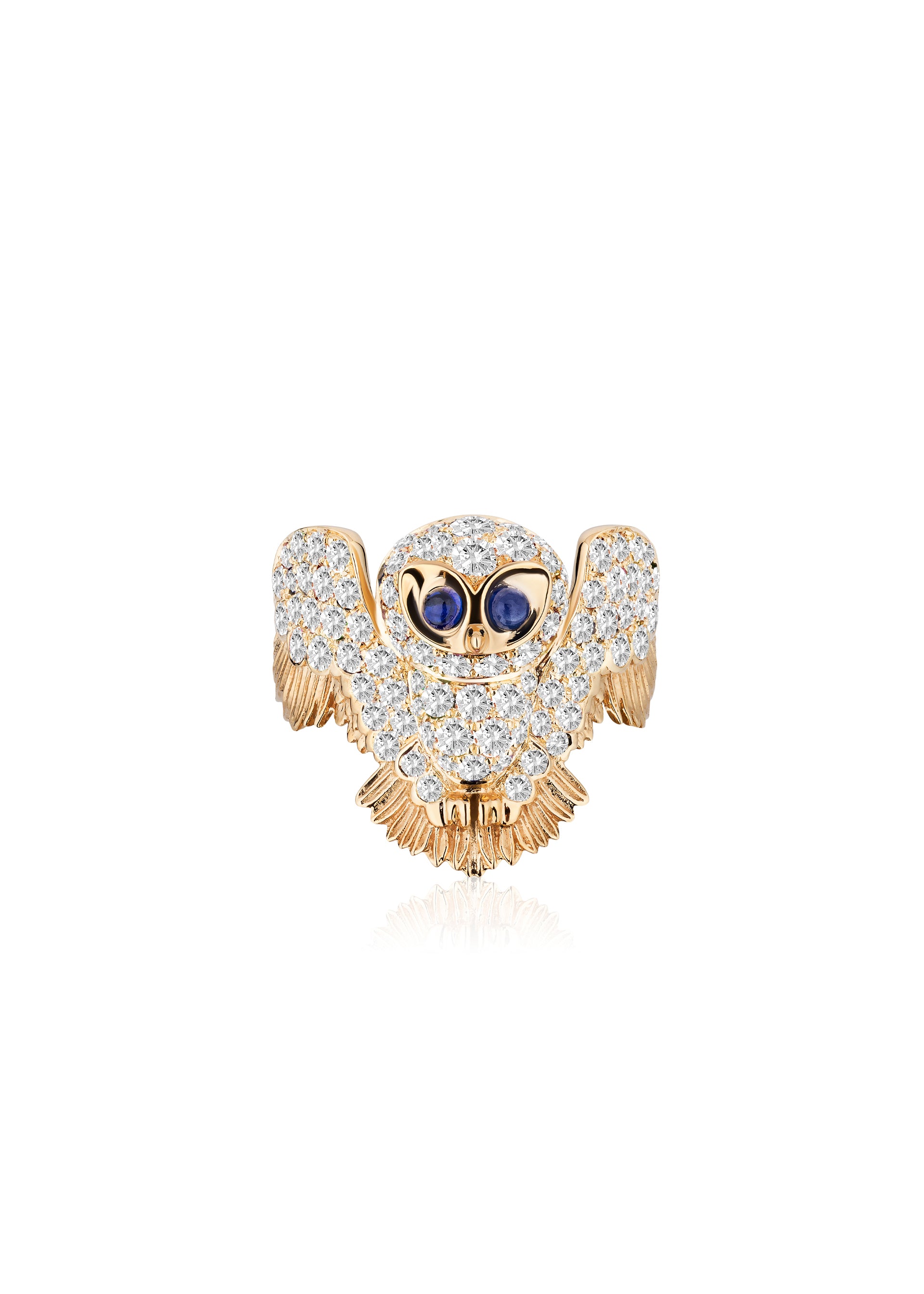 With outstretched wings and wide sapphire eyes, the owl ring is a striking fusion of mystery, grace, and radiant detail.