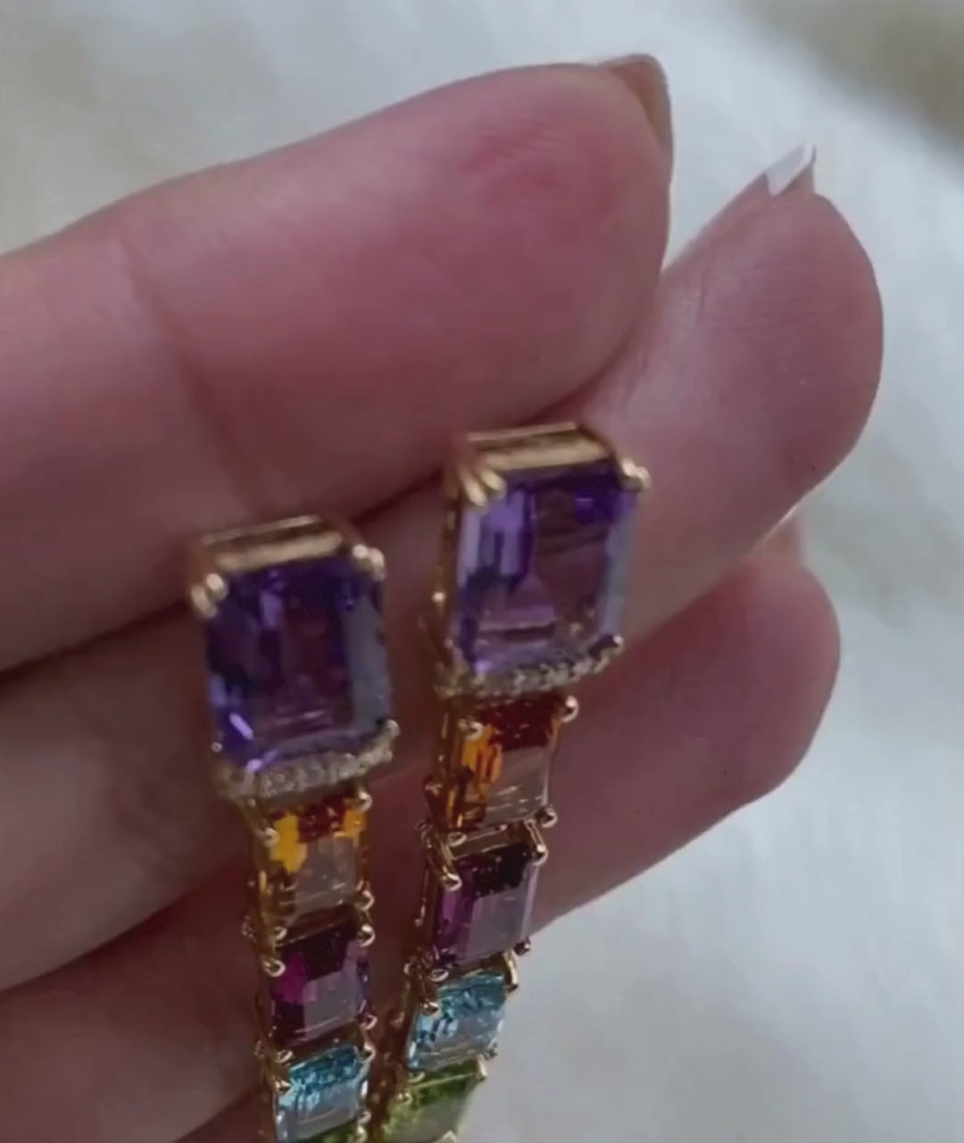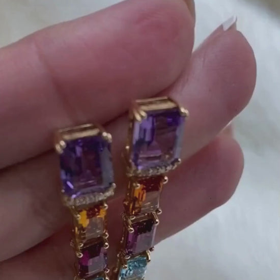 A vertical parade of emerald-cut stones, each link in these earrings brings a new burst of energy. With crisp symmetry and vibrant hues, this design is a celebration of color in motion.