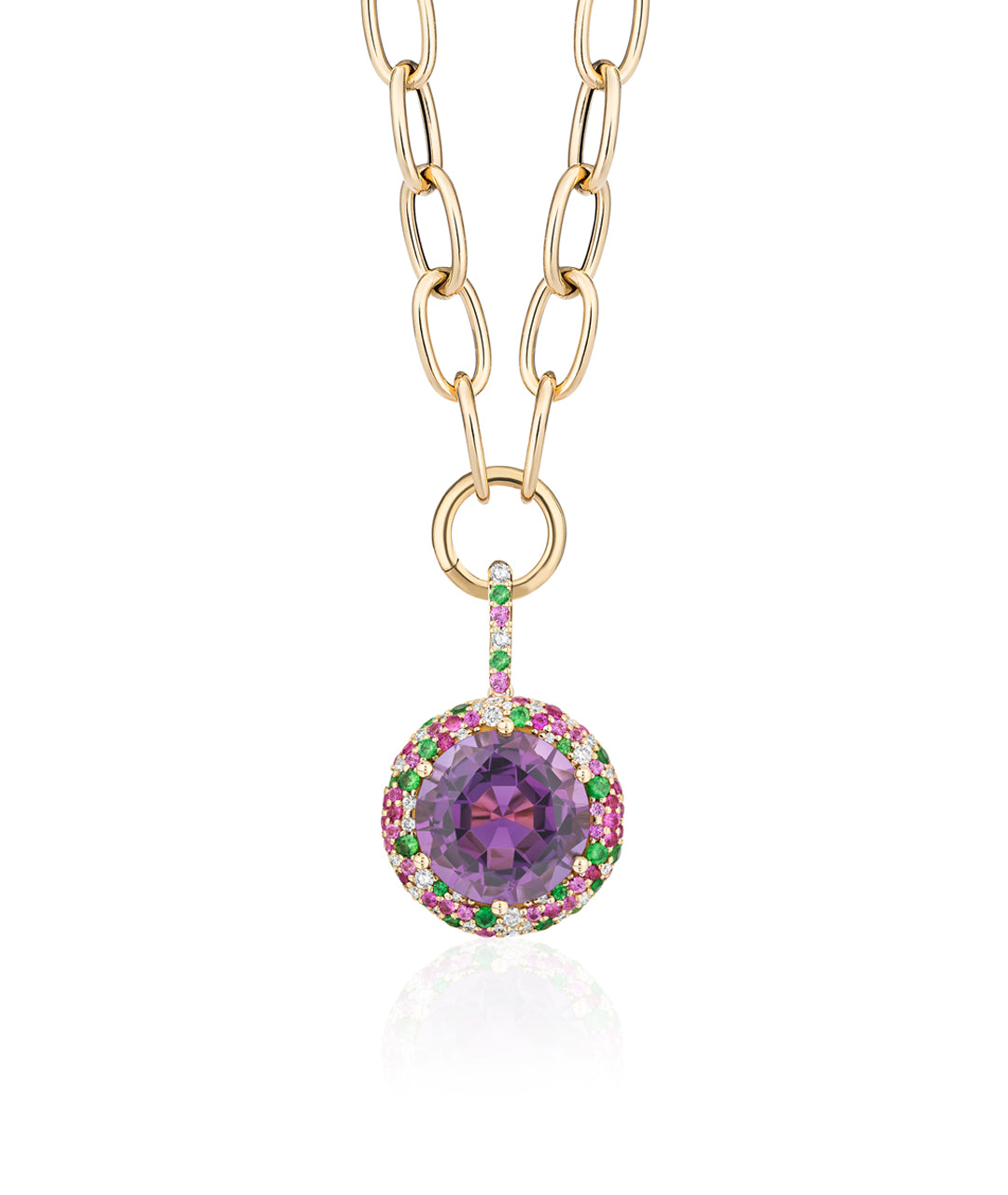 A radiant round pendant framed in multicolored pavé dangles from a bold chain, evoking the vibrance of the rainforest.